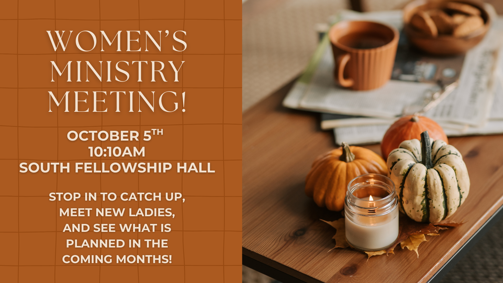 All ladies are welcome to stop by and say hi, meet new friends, and hear what is coming up in the next few months for Women’s Ministry. There will also be a service project at this meeting - stuffing goodie bags for Pumpkin Palooza on October 19th